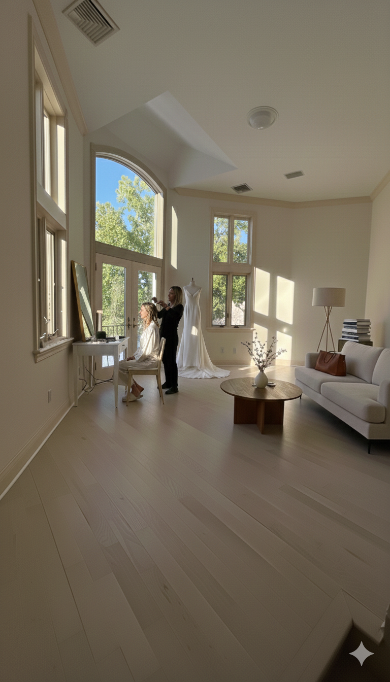 A light-filled space within the estate for a calm and seamless wedding morning.